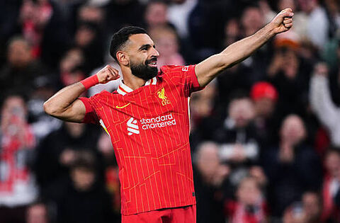 Liverpool’s Mohamed Salah raises his right arm in celebration