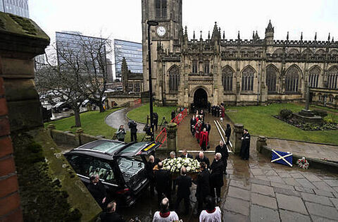 The hearse made its way into the city centre from Old Trafford, where hundreds of fans congregated as the funeral cortege passed a ground where Law’s success saw him immortalised in two statues.