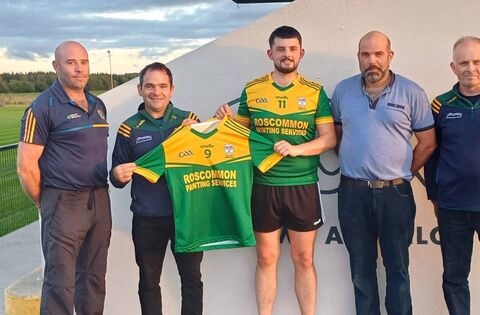Enda Hoban and Marty Hoban, on behalf of Roscommon Painting Services, present a set of jerseys to the Oran senior hurling panel. L-r: Enda Hoban, sponsor; Damien Kenny, Oran Hurling Chairperson; Shane Keane, Oran senior hurling captain; Marty Hoban, sponsor, and Tom Healy, Oran Hurling Treasurer.