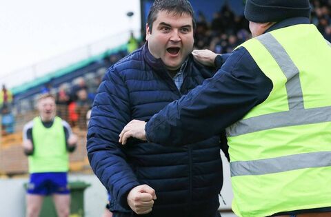 Roscommon GAA Chairperson, Brian Carroll, celebrates the county senior footballers' famous five-point Division One League victory against Tyrone at Dr. Hyde Park in January. Picture: Bernie O'Farrell