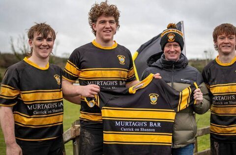 Kenny Murtagh, Murtagh's Bar, presents a set of jerseys to the Carrick-on-Shannon U-18.5 team following their win over Corrib. Pictured are Jack Deegan, joint vice-captain; Diarmuid O’Connell, joint vice-captain; Kenny Murtagh, sponsor, and Gerard Murtagh, captain.