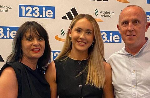Hollie Kilroe with her parents, Siobhan and Fintan, after winning the Athletics Ireland Star Award for County Roscommon Juvenile Athlete in 2024.