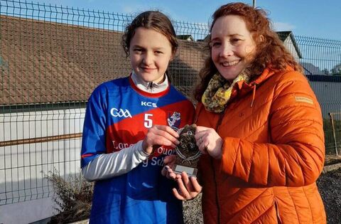 Amelia Bury, Lanesboro NS, receives her Player of the Tournament award from Ms Hazel Hannon, Lanesboro Community College Principal, following the recent five-a-side tournament for local national schools organised by Ballyboro FC.