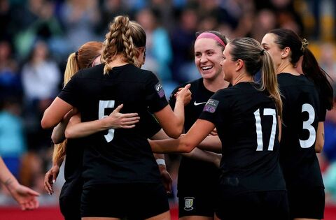Kayleigh Shine (no3) and her Athlone Town teammates celebrate their fourth goal against Cardiff City. Picture: INPHO/Tom O’Hanlon