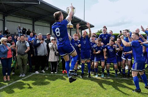 JUMPING FOR JOY: St. John's Athletic captain, Simon Leonard, celebrates with his team-mates after getting his hands on the Challenge Cup following Sunday's emphatic victory against Glen Celtic at the Roscommon and District League Football Grounds, Lecarrow. Pictures: Gerard O'Loughlin