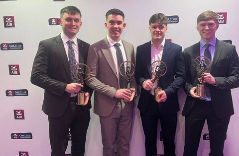 St. Brigid's players Brian Stack, Ruaidhrí Fallon, Ben O'Carroll and Pearse Frost with their awards after being picked on AIB Club Football Team of the Year.