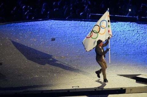 After greeting Olympians in the crowd, he shook hands with Bass before taking the Olympic flag from her and hopping on a motorcycle to take it on a joyride out of the stadium.