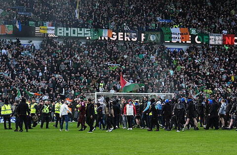 Dozens of travelling Celtic fans spilled onto the pitch to celebrate and more than 100 Rangers fans charged to confront them.