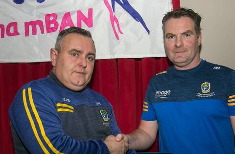 Roscommon LGFA Chairperson, Declan Walsh, makes a presentation to 2023 U-14 girls' football manager, Martin Mulvihill, at the Roscommon LGFA underage presentations in Hannon's Hotel. Picture: Michelle Hughes Walsh