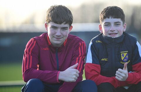 Alex Moore and Cormac McGuinness supporting Roscommon CBS during their All-Ireland Senior Colleges football championship semi-final success against St. Peter's College, Dunboyne, in Abbotstown on Saturday. Picture: Gerard O'Loughlin