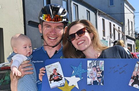 Daire Feeley with wife Olivia and son Liam following the opening stage of the Rás Tailteann in Boyle earlier this year. Picture: Gerard O'Loughlin