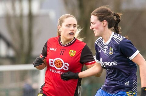 Roscommon full-back Áine Connaughton tracks Down's Eimear Fitzpatrick during last Sunday's Division Three League game at Cherryvale Playing Fields, Belfast. Picture: Michelle Hughes Walsh
