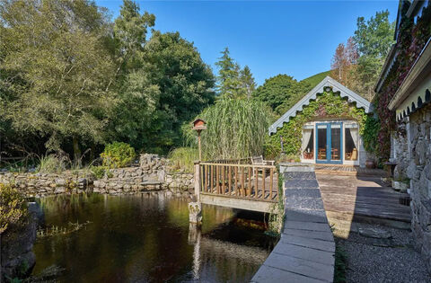 At the rear of the house, the mill race has been integrated into the landscape design, bordered by a spacious decking area accessed from the drawing room. A wooden bridge leads across the water to a plethora of woodland walks which offer views of the Annamoe River.