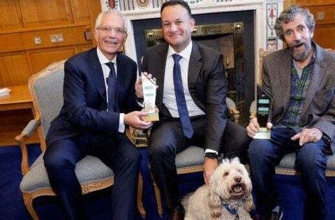 Paul Allen, Taoiseach Leo Varadkar, Charlie Bird and his dog Tiger.