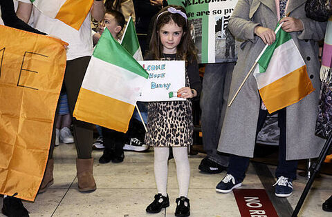 The soldiers’ children, partners and grandparents waved handmade signs and UN and Irish flags in the arrivals hall at Terminal 1 of Dublin Airport as they waited for their loved ones to appear.