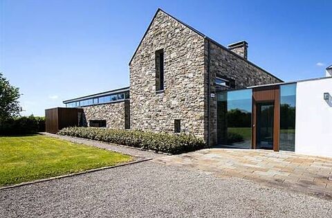 Curraghmore House is a home set on over two acres of countryside. Natural stone, timber, and large windows give it a contemporary feel.