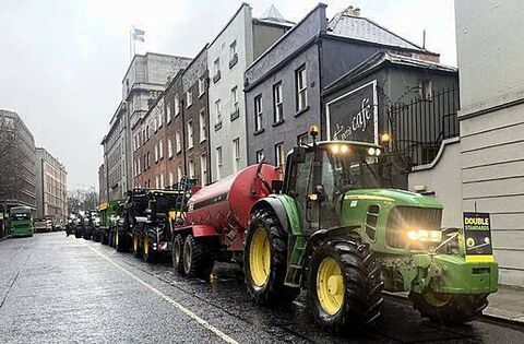Fifteen tractors park along Kildare Street in Dublin near Leinster House as part of the Irish Farmers’ Association’s call for Bord Bia’s chairman to resign