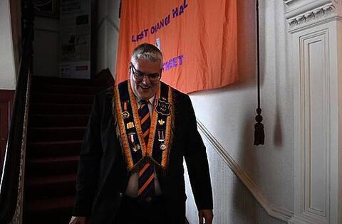 Members of the Orange order gather at Clifton street Orange hall in Belfast