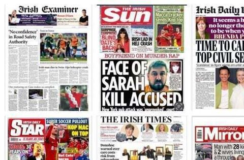The Irish Sun leads with a story on the man accused of killing Irish woman Sarah McNally in a New York pub.