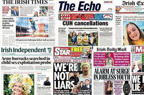 The Echo's front page features a story regarding a total of 7,072 paediatric appointments and surgeries being cancelled in Cork University Hospital over the last five years, according to HSE figures.