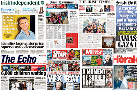 The prospects for peace in Gaza after two years of conflict dominate the front pages, alongside reports on the seemingly fractious departure of Ray D'Arcy from RTÉ.