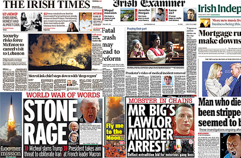 The Irish Daily Mirror leads with criticism from the Taoiseach over Donald Trump threatening to bomb Iran to the "stone age."