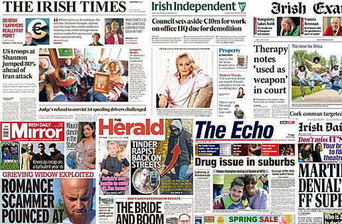 The Irish Daily Mirror lead with a romance fraudster preying on a young, vulnerable woman whose husband died suddenly, meeting her at her husband's wake and stealing €140,000 from her.