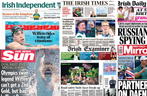 The Irish Times goes with image of Rhys McClenaghan, who took gold in the men's pommel horse final on Saturday, alongside Daniel Wiffen, who claimed bronze in the men's 1500m freestyle on Sunday, brining Team Ireland to its largest ever Olympic medal haul.