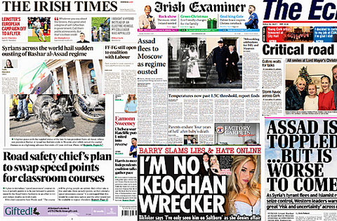 The Irish Times leads with celebrations from Syrian people across the world as al-Assad leaves 13 years of war.
