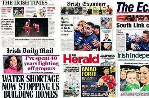Simon Harris rejecting claims that Ireland is anti-Israel hits the front page of Monday's Irish Examiner, as well as Sarsfields players celebrating their victory in the AIB All-Ireland Club Senior Hurling Championship semi-final against Derry side Slaughtneil.