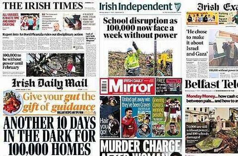 The Belfast Telegraph says 74,000 remain without power in the North after Storm Éowyn.