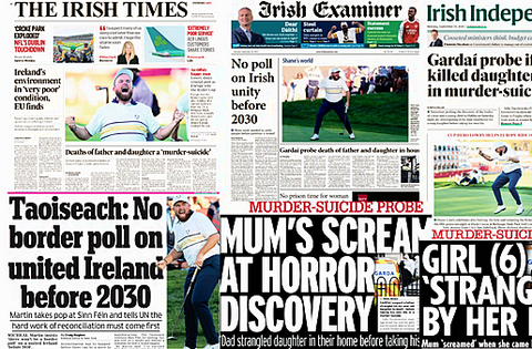 A border poll ruled out until 2030, and the death of a man and child in Dublin made the front pages of Monday's papers.