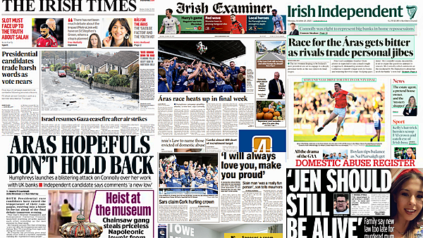 The Irish Independent and the Irish Daily Mail also lead with comments made by both candidates in the Presidential election.