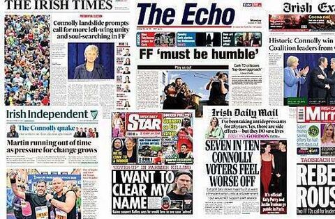 The Irish Times leads with Catherine Connolly's landslide victory prompting more left-wing unity and soul-searching in Fianna Fáil.