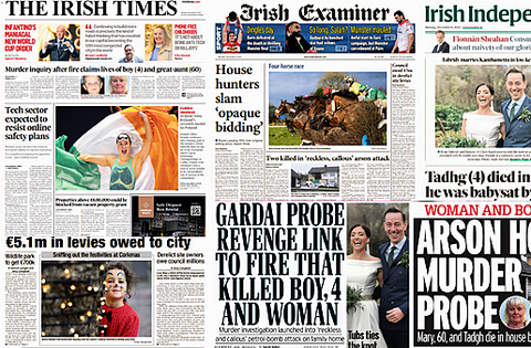 The Irish Independent leads with the death of Tadhg in a firebomb as he was babysat by his grandaunt.