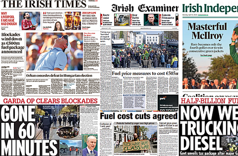 The Government's fuel package, after days of protests and Rory McIlroy winning the Masters, makes the front pages of Monday's papers.