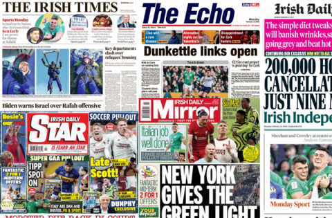 Meanwhile, The Echo marks the opening of the €215 million Dunkettle Intercharge, and joins many of the nationals in featuring an image from Ireland's 36-0 win over Italy at the Aviva on Sunday, showing Munster fly-half Jack Crowley crossing the whitewash to claim his first try of the tournament.