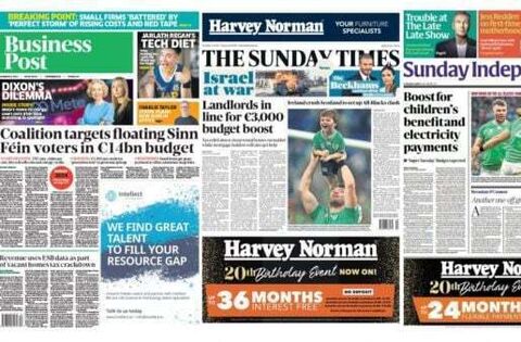 The Sunday papers focus on next week's budget, the fresh conflict between Hamas and Israel, and Ireland's victory over Scotland at the Rugby World Cup.