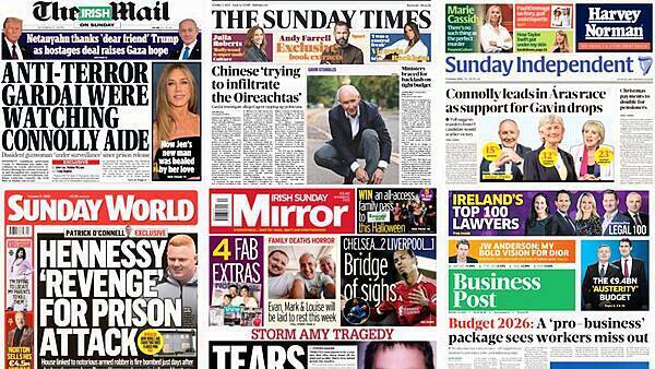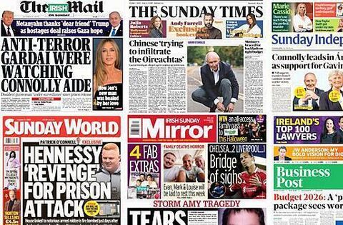 The Irish Mail on Sunday lead with Ursula Ní Shionnáin, who was previously jailed on gun offences, having been under surveillance by anti-terror gardaí following her release from prison and throughout her employment at Leinster House with presidential candidate Catherine Connolly.