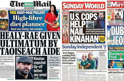 The Sunday World leads with US government officials helping gardaí build a case against Daniel Kinahan by hacking into encrypted devices seized from Cartel lieutenant Sean McGovern.