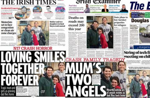 The Irish Daily Mirror and the Irish Daily Star lead with photos of the mother and her two children killed in Tuesday's crash, as the father of the family flies home.