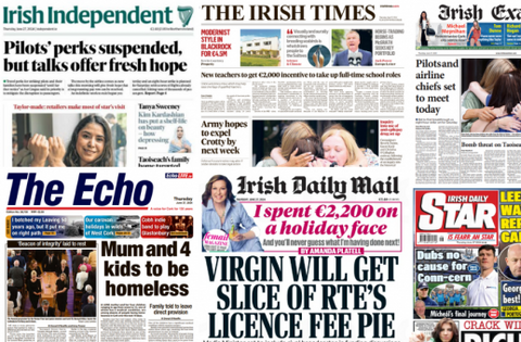 The Irish Daily Mail reads: 'Virgin will get slice of RTÉ's licence fee pie', under plans from Minister for the Media Catherine Martin.