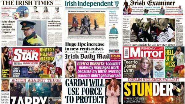 The Irish Times and the Irish Daily Mail focus on the Garda's enhanced riot response, with gardaí to be equipped with Tasers, water cannons and stronger pepper spray to avoid a repeat of scenes in Dublin last week.