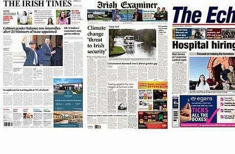 Thursday's front pages focus on a range of stories from a row brewing over gender balance in the newly announced Cabinet to climate change posing a threat to Irish society.