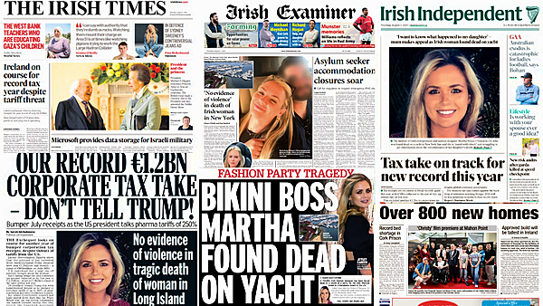 The Irish Daily Mail leads with the country's July tax receipts, despite the potential threat of tariffs.
