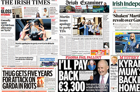 Micheál Martin's apology to Fianna Fáil over how Jim Gavin’s candidacy ended makes the front pages of many of Thursday's papers.