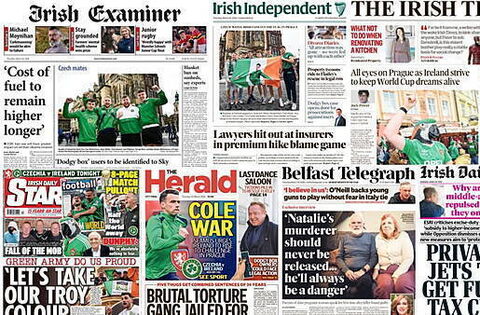 The Irish Times lead with Ireland's World Cup qualifier against the Czech Republic, consumers facing months of rising prices and Sky being given the details of 300 'dodgy box' users.