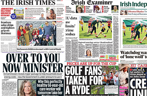 The Irish Times leads with Iran seizing two ships in the Strait of Hormuz, tightening its grip on the strait, amid reports