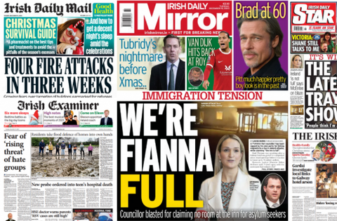 The Irish Daily Mirror leads with comments from Galway Fianna Fáil councillor Noel Thomas on immigration following the fire.