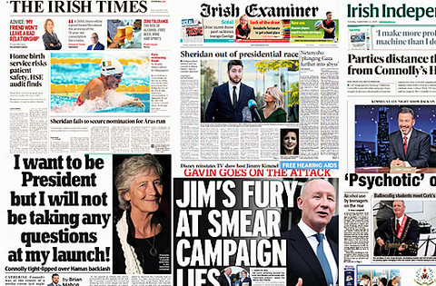 The Irish Examiner leads with Gareth Sheridan out of the presidential race, with Independent Ireland crucial to Maria Steen's chances.